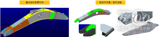工作裝置:動臂前叉改為鍛件,中段局部加厚,斗桿后側(cè)板加厚至鍛件后支承后度,壽命大幅提升。優(yōu)化焊接工藝單面焊雙面成型,TIG焊趾修溶,錘擊等工藝,消除應(yīng)力集中。強(qiáng)化局部高應(yīng)力部位,平均應(yīng)力下降10%以上,設(shè)計壽命提升至12000H。