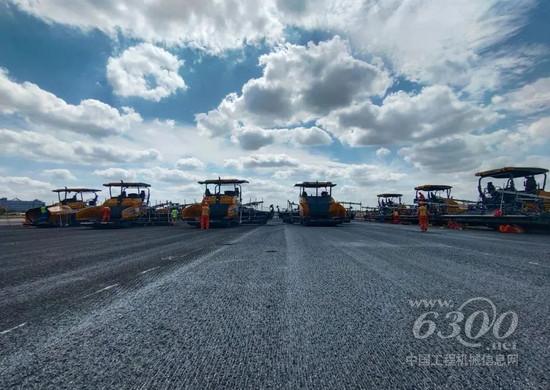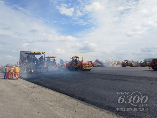 施工現(xiàn)場,攤鋪路面長3.2km,寬60m,11條聯(lián)絡(luò)道面積7000m2 ,徐工道路機(jī)械出動(dòng)10臺(tái)XD133D雙鋼輪壓路機(jī)、7臺(tái)RP1253T攤鋪機(jī)、1臺(tái)RP1355T攤鋪機(jī)輪番登場,在高等級(jí)路面的道路面層進(jìn)行瀝青罩面。