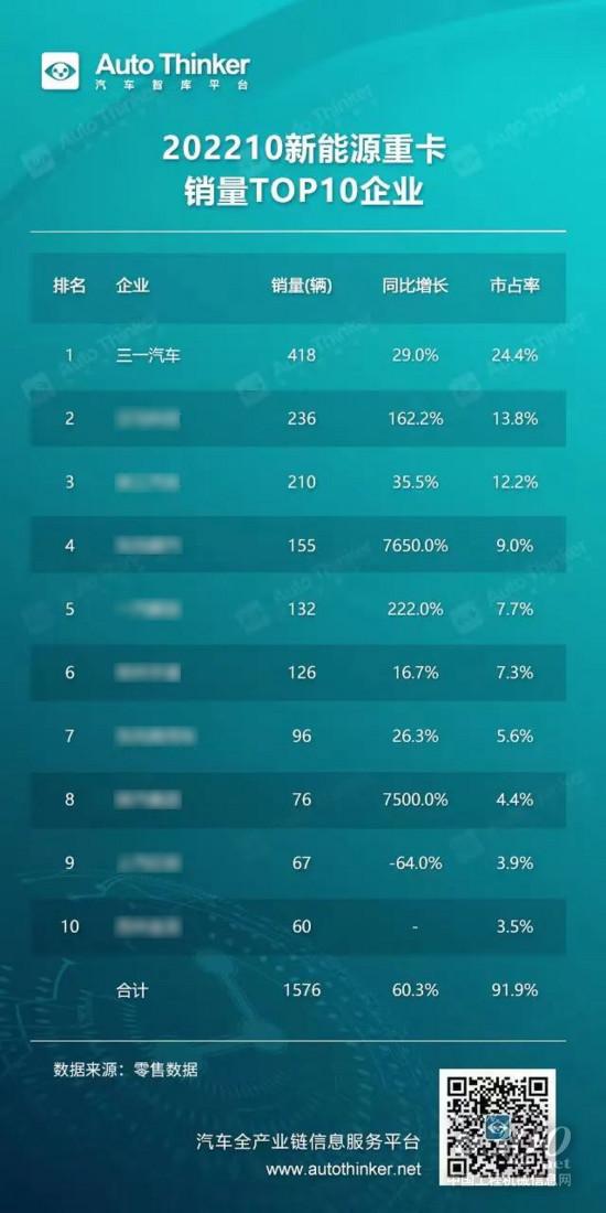 根據(jù)汽車智庫(kù)平臺(tái)最新數(shù)據(jù)顯示,10月,三一新能源重卡以418臺(tái)的銷量,市占率達(dá)24.4%,再次蟬聯(lián)新能源重卡全國(guó)月銷量冠軍。