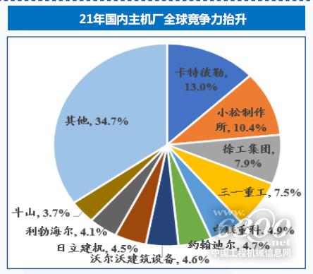 其實(shí),近幾年海外市場已成工程機(jī)械的主戰(zhàn)場。據(jù)英國KHL統(tǒng)計(jì),2021年徐工(集團(tuán))、 三一、中聯(lián)的工程機(jī)械全品類綜合市占率分別為7.9%/7.5%/4.9%,全球排名提升至3-5位,同時(shí)Off-Highway Research的數(shù)據(jù)也顯示2020 年三一首次奪得全球挖機(jī)銷量冠軍,單品類市占率達(dá)15%,疊加疫情期間國內(nèi)龍頭主機(jī)廠的ROE水平已超越卡特彼勒、小松等國際巨頭,全球競爭力抬升明顯。