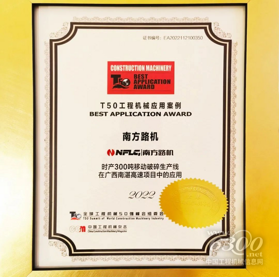 憑借強勁實力,南方路機產(chǎn)品在全球各地的施工項目當(dāng)中,造就了一批經(jīng)典應(yīng)用案例。本屆峰會上,南方路機時產(chǎn)300噸移動破碎篩分設(shè)備憑借在廣西南湛高速項目中的出色表現(xiàn)榮膺“2022 T50工程機械應(yīng)用案例”。南方路機移動破碎篩分設(shè)備無論是在國家重點大型工程項目、礦山、民生工程等項目中,還是在細分產(chǎn)品領(lǐng)域的應(yīng)用都極具代表性。南方路機移動破碎篩分設(shè)備都展現(xiàn)出了極高的研發(fā)制造實力,在行業(yè)推出了一大批成功應(yīng)用案例,有著較高的品牌影響力和市場競爭力。