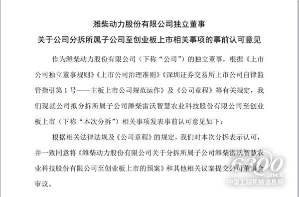 11月23日,濰柴動力發(fā)布公告稱,其擬分拆子公司濰柴雷沃智慧農(nóng)業(yè)科技股份有限公司(以下簡稱“濰柴雷沃”)至創(chuàng)業(yè)板上市。分拆完成后,濰柴動力股權(quán)結(jié)構(gòu)不會發(fā)生變化,且仍將維持對濰柴雷沃的控股權(quán)。
