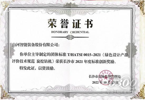 11月25日,在湖南省市場監(jiān)督局主辦的“世界標(biāo)準(zhǔn)日”主題宣傳暨標(biāo)準(zhǔn)進(jìn)園區(qū)活動(dòng)上,山河智能裝備牽頭制定的T/HATSI 0015-2021《綠色設(shè)計(jì)產(chǎn)品評(píng)價(jià)技術(shù)規(guī)范 旋挖鉆機(jī)》獲得長沙市2021年度標(biāo)準(zhǔn)創(chuàng)新獎(jiǎng)勵(lì)。