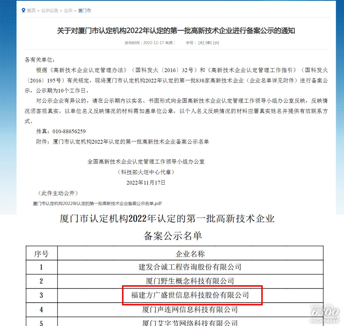 近日,根據(jù)《高新技術(shù)企業(yè)認定管理辦法》(國科發(fā)火〔2016〕32號)和《高新技術(shù)企業(yè)認定管理工作指引》(國科發(fā)火〔2016〕195號)公示結(jié)果顯示,福建方廣盛世信息科技股份有限公司(簡稱“方廣盛世股份”)憑借自身過硬的技術(shù)實力與創(chuàng)新能力,順利通過層層評審、榮登榜單之中,被認定為“國家高新技術(shù)企業(yè)”。