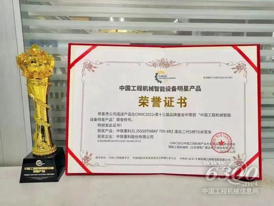 ▲中聯(lián)重科70米泵車獲評“中國工程機械智能設備明星產(chǎn)品”