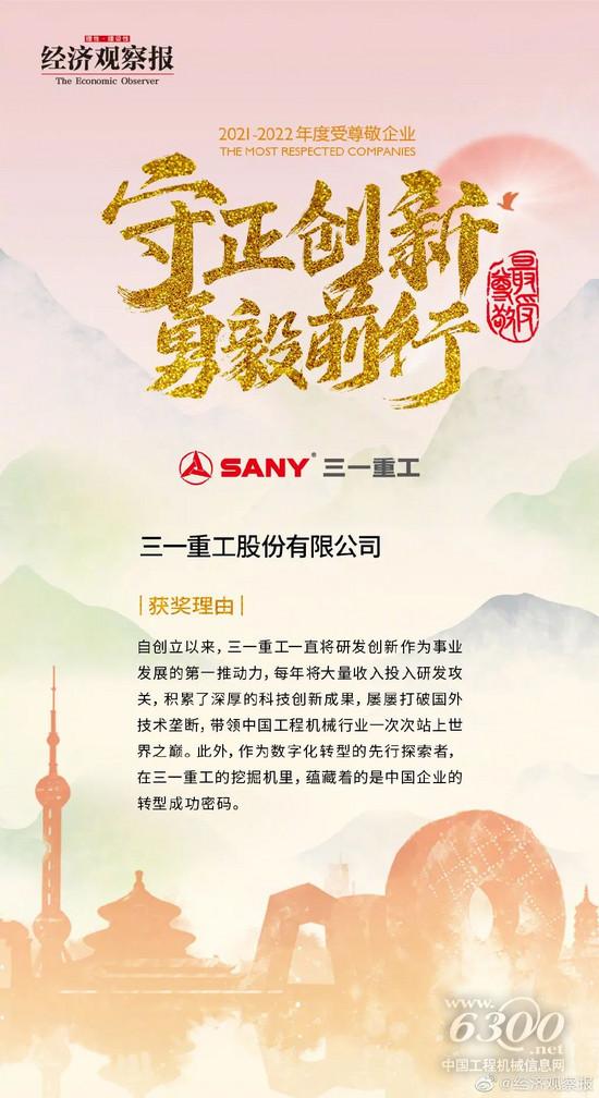 近日,經(jīng)濟觀察報2021-2022年度中國最受尊敬企業(yè)線上峰會暨頒獎盛典舉辦,三一重工榮獲“中國最受尊敬企業(yè)”稱號。
