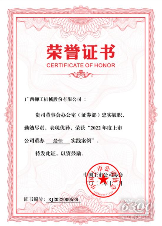 近日,中國上市公司協(xié)會(簡稱:中上協(xié))發(fā)布“2022年上市公司董事會秘書履職評價”結(jié)果及“2022上市公司董辦最佳實踐”評選結(jié)果。廣西柳工機械股份有限公司榮獲“2022年度上市公司董辦最佳實踐案例”,公司董事會秘書黃華琳榮獲“2022年上市公司董事會秘書履職評價5A級”。柳工憑借規(guī)范性治理結(jié)構(gòu)、高質(zhì)量治理效能、圍繞公司核心能力的資本運作、積極踐行社會責任等卓越表現(xiàn),成為工程機械行業(yè)和廣西唯一獲此殊榮企業(yè)。