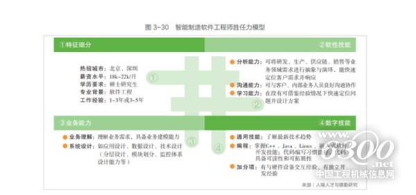 以智能制造“軟件工程師”崗位的勝任力模型為例,其“井”型結(jié)構(gòu)勝任力模型包括了四個(gè)方面。一是基本特征,包含熱招城市分布、薪酬水平、學(xué)歷要求、專(zhuān)業(yè)背景、工程經(jīng)驗(yàn);二是軟性技能,是貫穿整個(gè)行業(yè)、領(lǐng)域、技能的通用能力,包含分析、溝通和學(xué)習(xí)能力;三是該崗位的業(yè)務(wù)能力,包括業(yè)務(wù)理解和系統(tǒng)設(shè)計(jì)方面的能力;最后是數(shù)字技能,指的是從“廣度”和“深度”上對(duì)數(shù)字化技術(shù)的知識(shí)和技能的掌握,例如對(duì)編程語(yǔ)言的掌握,項(xiàng)目經(jīng)驗(yàn)等。