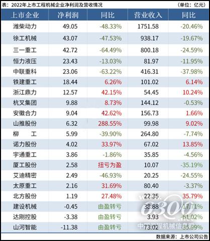 據(jù)不完全統(tǒng)計截至4月30日,共有20家工程機械行業(yè)上市企業(yè)公布2022年經(jīng)營業(yè)績,合計營收達5161.08億元,合計實現(xiàn)凈利潤為244.66億元,17家企業(yè)實現(xiàn)盈利。