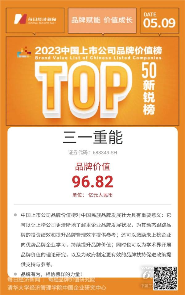 此外,在對所有2022年新上市的國內(nèi)公司進行測評后,每日經(jīng)濟新聞還選取出品牌價值排名居前的50家公司形成“新銳榜”TOP50,三一重能以96.82億元的品牌價值高位上榜,排名第四。這不僅是三一重能不斷深耕品牌價值的結(jié)果,也體現(xiàn)出業(yè)界對三一重能的充分認可和堅定信心。