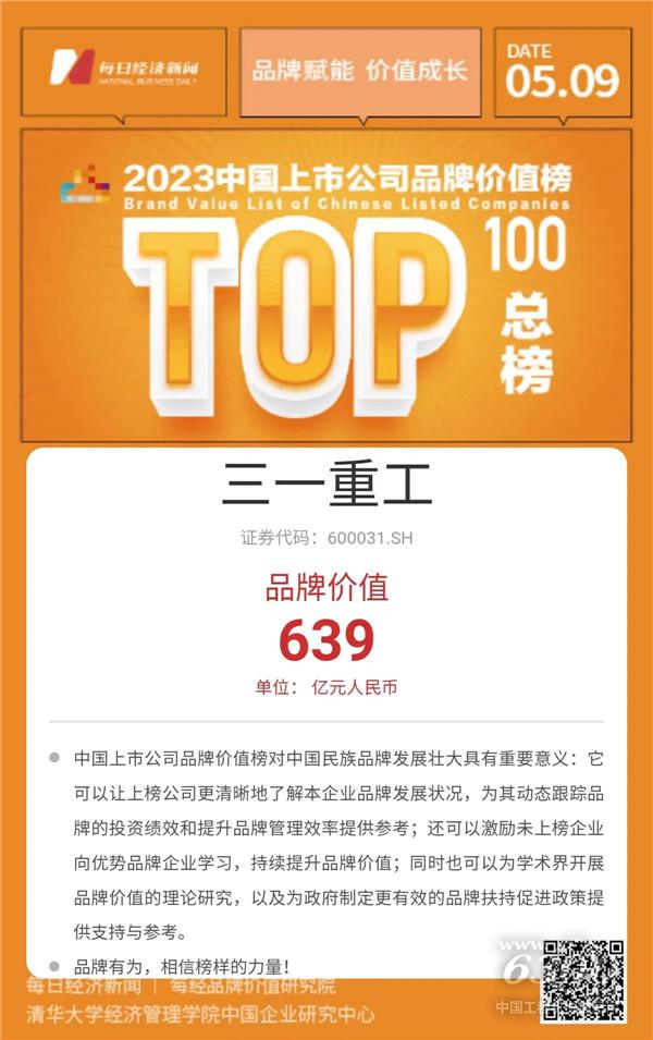 在總榜“2023中國上市公司品牌價值榜”中,三一重工以639億元的品牌價值,位列總榜第71名,穩(wěn)居工程機械行業(yè)第一。