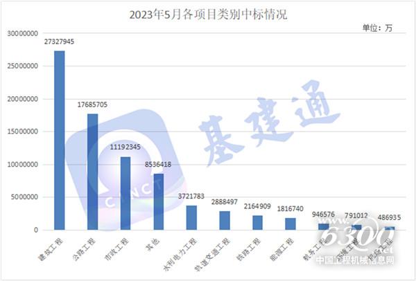 據(jù)基建通大數(shù)據(jù)統(tǒng)計,2023年5月基建領(lǐng)域5億+大項目中標(biāo)約 563 項,總金額約 7755 億。其中:建筑工程(房建)中標(biāo)額最高,約2732億,其次是公路工程和市政工程,分別是1768億和1119億。
