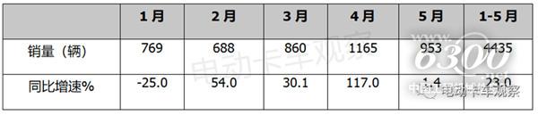 終端上牌數(shù)據(jù)顯示,2023年5月?lián)Q電重卡銷售953輛,同比去年5月的940輛增長1.4%,比上月117%的增幅收窄了近115.6個百分點,增速明顯趨緩;環(huán)比今年4月的1165輛銷量下降18.2%。2023年1-5月?lián)Q電重卡累計銷售4435輛,與去年同期的3608輛累計銷量相比增長23%,同比增幅比今年1-4月的31%收窄了近8個百分點。