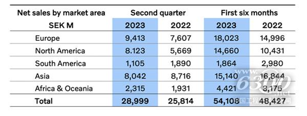沃爾沃建筑設(shè)備2023年第二季度及上半年凈銷售額數(shù)據(jù)(按區(qū)域劃分)
