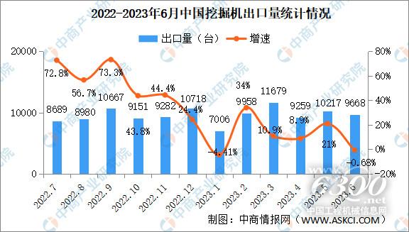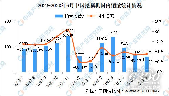 2023年6月銷售各類挖掘機15766臺,同比下降24.1%,其中國內6098臺,同比下降44.7%;出口9668臺,同比下降0.68%。