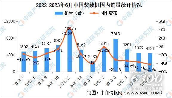 2023年6月銷售各類裝載機8556臺,同比下降25.3%。其中國內市場銷量4321臺,同比下降42.9%;出口銷量4235臺,同比增長8.98%。