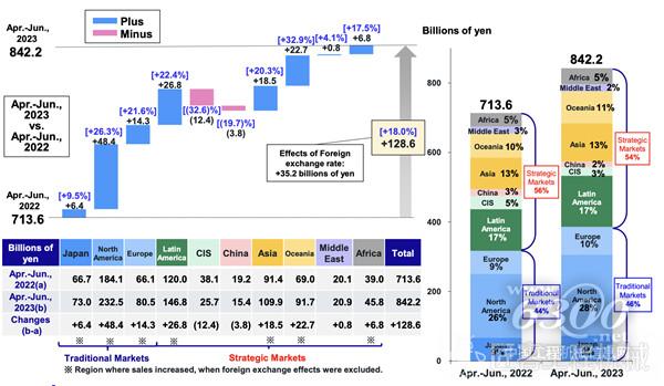 其中,傳統(tǒng)市場(日本、北美、歐洲)銷售額占比為46%,新興市場銷售額占比為54%。