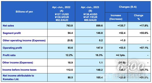 小松近日發(fā)布最新業(yè)績報告,2023年4-6月(2023財年第一季度),合并凈銷售額為8996億日元,比2022年同期(7638億日元)增長17.8%,漲幅與去年同期持平。
