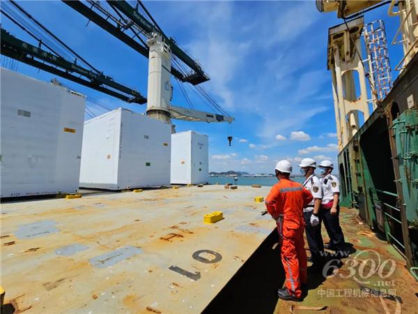 “本次出口大件較以往有很大不同。這批產(chǎn)品代表了目前中國(guó)工程建設(shè)產(chǎn)品的頂尖水平,國(guó)外項(xiàng)目部對(duì)此非常重視。由于重型工程設(shè)備裝載作業(yè)難度大,加上臺(tái)風(fēng)天氣復(fù)雜多變,貨物的裝載、壓載、系固綁扎、穩(wěn)性調(diào)整等安全作業(yè)都十分重要。”東莞沙田海事處執(zhí)法人員吳焰宏表示,海事部門每天巡查船舶作業(yè)情況,利用CCTV、AIS等對(duì)貨物裝載過程實(shí)時(shí)監(jiān)控。