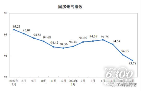 房地產(chǎn)消費需求及信心尚不足,恢復有待時日,疊加土地購置費及房屋新開工面積下滑,房地產(chǎn)行業(yè)以“保交樓”和“去庫存”為主,投資短期內難以有效提振。2023年1—7月,全國房地產(chǎn)開發(fā)投資67717億元,同比下降8.5%。1—7月,房地產(chǎn)開發(fā)企業(yè)房屋施工面積799682萬平方米,同比下降6.8%。房屋新開工面積56969萬平方米,下降24.5%。2023年7月,房地產(chǎn)開發(fā)景氣指數(shù)為93.78,持續(xù)下降。