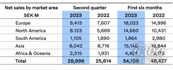 沃爾沃建筑設(shè)備2023年上半年凈銷售額,單位:百萬瑞典克朗