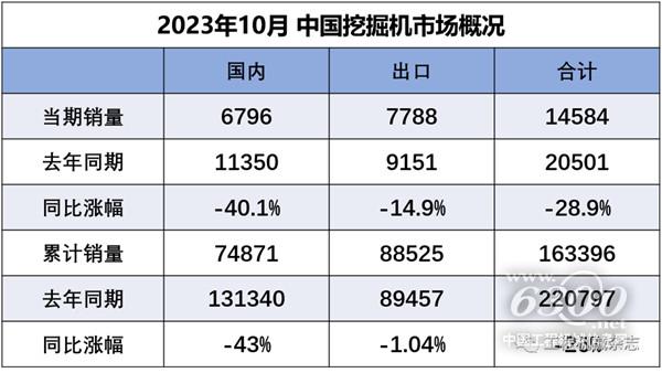 2.2023年10月挖掘機(jī)國(guó)內(nèi)市場(chǎng)銷量6796臺(tái),同比下降40.1%;