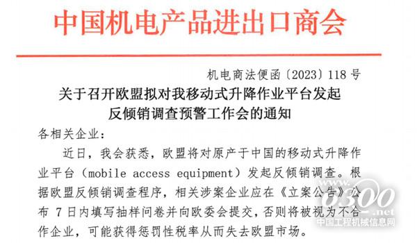 2023年11月8日,中國機(jī)電產(chǎn)品進(jìn)出口商會的一則聲明顯示,歐盟將對原產(chǎn)于中國的移動式升降作業(yè)平臺(mobile access equipment)發(fā)起反傾銷調(diào)查......