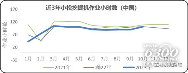 2023年10月,中國(guó)地區(qū)小松挖掘機(jī)開工小時(shí)數(shù)為101.7小時(shí),同比增長(zhǎng)0.2%,這也是繼2023年3月,本年度單月第2次增長(zhǎng)。