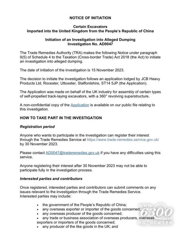 案件利害相關(guān)方可登陸TRA網(wǎng)站注冊(cè)是自行式履帶鋪設(shè)(即履帶式)挖掘機(jī),上部結(jié)構(gòu)可 360° 旋轉(zhuǎn),操作重量為 11,000 公斤(即 11 噸)或以上。