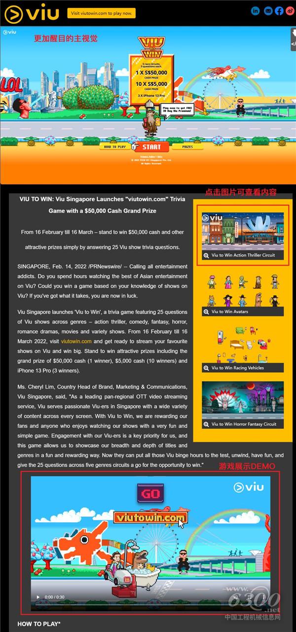 這是企業(yè)發(fā)布新聞的基礎價值,能夠提供關鍵信息,讓受眾閱讀新聞。但此外新聞稿還有一個價值是,它是一個溝通契機,就像一個“窗口”一樣,可以在提供新聞的同時,融入更加豐富的企業(yè)信息供受眾了解,從而達成更為深度的溝通,這就是從“閱讀新聞信息”升級至心智上的“感受企業(yè)新聞”。舉一些場景案例,你會發(fā)現(xiàn)這確實存在著剛需。||| Case1第一個典型場景是,每當企業(yè)有非常重要或信息量較多的新聞時,文字內(nèi)容對于體現(xiàn)新聞全貌是有一定實操難度的。因為PR很容易寫到篇幅過長,從而淹沒重點;或者想介紹的產(chǎn)品等內(nèi)容是抽象的、機制很復雜的,很難用文字體現(xiàn),從而增加受眾的閱讀理解成本。此時就可以考慮在文字之余,在一篇新聞稿中增加多級頁面,插入更多的解讀圖片或視頻等素材,這樣不僅能增加單篇新聞的信息容量,還能使之看起來更加整潔與美觀。比如下面這個案例來自東南亞的視頻流媒體Viu,該企業(yè)近期推出了一款小游戲,以期邀請用戶參與、提升粘性。品牌為了推廣游戲就需要發(fā)布新聞觸達用戶,并為媒體報道提供官方信息與相關素材。分析下品牌在這篇新聞稿中的難點是:“游戲”是重視覺呈現(xiàn)與實際操作的內(nèi)容,很難用文字展示其獨特體驗;同時這篇新聞包含了游戲玩法,參與獎勵等內(nèi)容,信息量很大。此時顯然就適合將這篇新聞稿有邏輯的劃分板塊,比如有可視化的素材來輔助呈現(xiàn)游戲內(nèi)容,同時有專門的視頻素材來介紹游戲體驗與參與獎勵。故此,“多媒體新聞”就成為了首選,下圖就是該新聞專頁的最終呈現(xiàn):