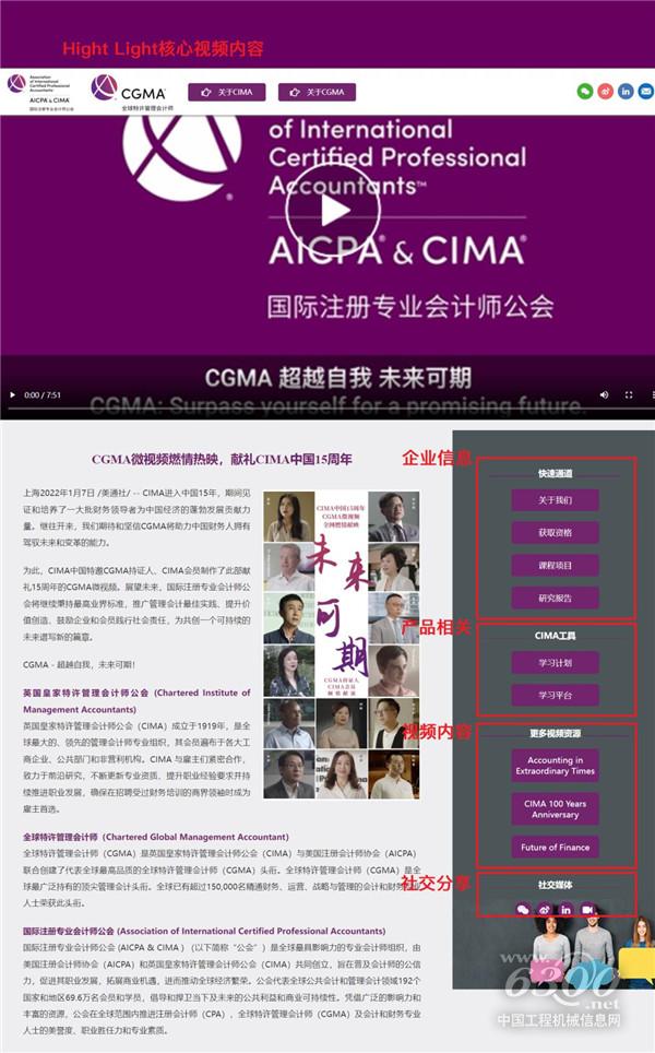再來看另一個常見場景:一位讀者,可能是產(chǎn)品用戶,也可能是投資者,他在某網(wǎng)站閱讀到一篇企業(yè)新聞內(nèi)容后,對該企業(yè)產(chǎn)生了進一步了解的興趣。此時他往往不得不輾轉好幾個途徑,打開若干個頁面,去搜尋查看企業(yè)信息。此時如果我們將這篇容易引發(fā)用戶興趣的新聞頁面中,直接嵌入更多企業(yè)相關內(nèi)容板塊,如企業(yè)歷史、核心產(chǎn)品、研發(fā)團隊、社交分享等等,是不是就有效提升了閱讀體驗和信息直達的效率?比如下面的案例來自CIMA,作為進入中國15周年的重要節(jié)點,該組織發(fā)布了一支視頻創(chuàng)意,新聞稿的核心目的正是吸引用戶觀看視頻。此外作為一個相對重要的時間節(jié)點,這篇新聞的歷史價值也很高,需要額外的重視。企業(yè)可以將這次溝通,作為一個受眾了解企業(yè)的契機。下面就是這篇“多媒體新聞稿”最終的呈現(xiàn):