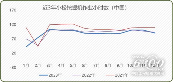 2023年12月,中國地區(qū)小松挖掘機(jī)開工小時數(shù)為90.7小時,同比下降3.3%。