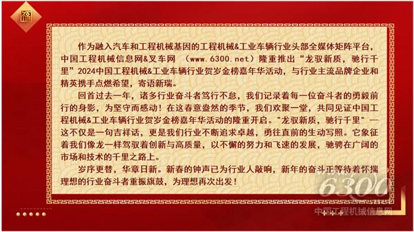 回首過去一年,諸多行業(yè)奮斗者篤行不怠,我們記錄著每一位奮斗者的勇毅前行的身影,為堅(jiān)守而感動(dòng)!在這春意盎然的季節(jié),我們歡聚一堂,共同見證中國工程機(jī)械&工業(yè)車輛行業(yè)賀歲金榜嘉年華活動(dòng)的隆重開啟。"龍馭新質(zhì),馳行千里" — 這不僅是一句吉祥話,更是我們行業(yè)不斷追求卓越,勇往直前的生動(dòng)寫照。它象征著我們像龍一樣駕馭著創(chuàng)新與高質(zhì)量,以不懈的努力和飛速的發(fā)展,馳騁在廣闊的市場(chǎng)和技術(shù)的千里之路上。