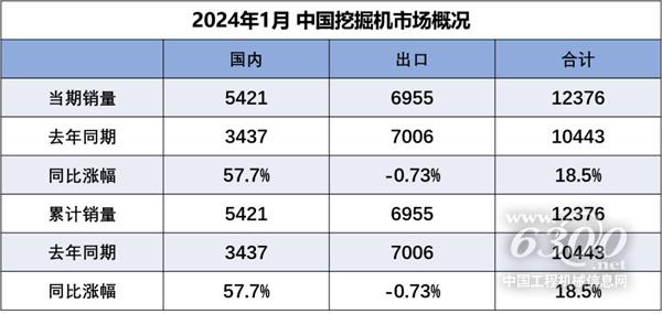 據(jù)中國(guó)工程機(jī)械工業(yè)協(xié)會(huì)對(duì)挖掘機(jī)主要制造企業(yè)統(tǒng)計(jì),2024年1月銷售各類挖掘機(jī)12376臺(tái),同比增長(zhǎng)18.5%,其中國(guó)內(nèi)5421臺(tái),同比增長(zhǎng)57.7%;出口6955臺(tái),同比下降0.73%。2024年1月銷售電動(dòng)挖掘機(jī)12臺(tái)(6噸級(jí)以下1臺(tái),18.5至28.5噸級(jí)11臺(tái))。