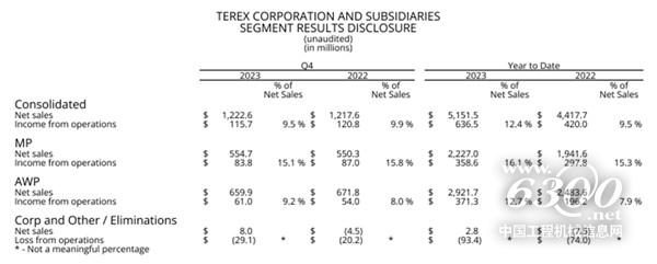 日前,特雷克斯集團(tuán)公布了其2023年第四季度及全年業(yè)績報(bào)告。報(bào)告顯示,特雷克斯集團(tuán)全年實(shí)現(xiàn)銷售額51.515億美元,同比增長16.6%;營業(yè)利潤6.365億美元,同比增長51.5%;營業(yè)利潤率12.4%,較上年提高2.9個(gè)百分點(diǎn)。