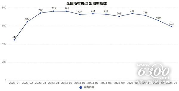 2024年1月升降工作平臺出租率指數(shù)為593點,環(huán)比下降10.15%、同比上升32.66%。由于2023年傳統(tǒng)春節(jié)假期在1月份,因此升降工作平臺各機型2024年1月份出租率指數(shù)同比均處于增長態(tài)勢,其中36m以上機型增幅最大,均超過50%。