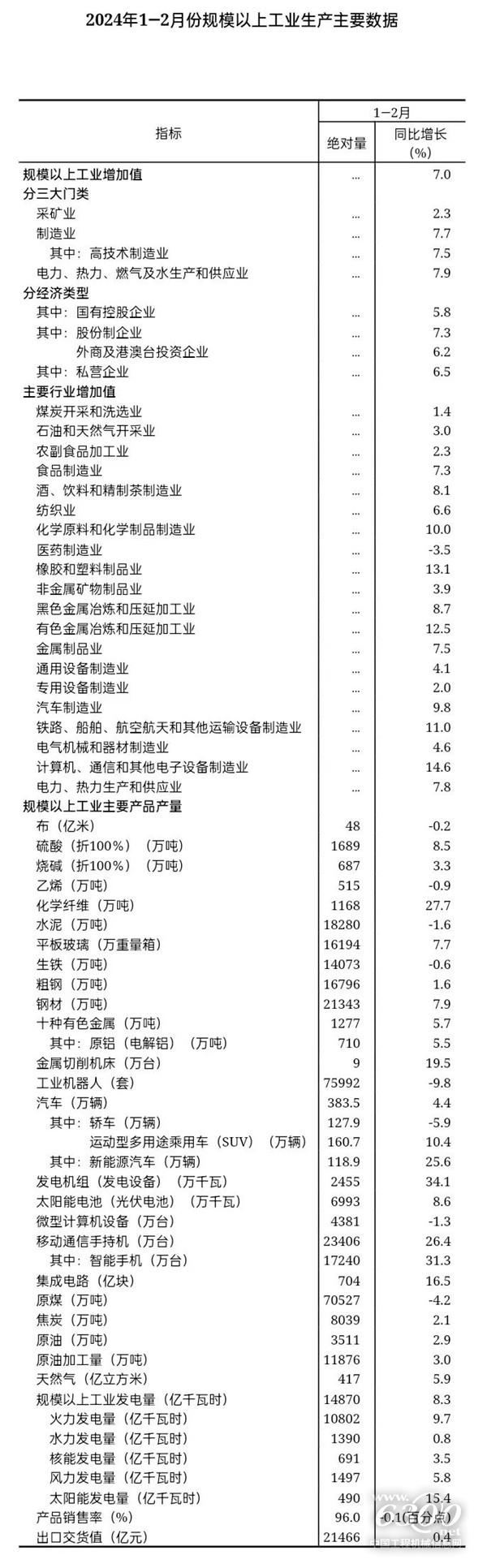 分產(chǎn)品看,1—2月份,619種產(chǎn)品中有418種產(chǎn)品產(chǎn)量同比增長。其中,鋼材21343萬噸,同比增長7.9%;水泥18280萬噸,下降1.6%;十種有色金屬1277萬噸,增長5.7%;乙烯515萬噸,下降0.9%;汽車383.5萬輛,增長4.4%,其中新能源汽車118.9萬輛,增長25.6%;發(fā)電量14870億千瓦時,增長8.3%;原油加工量11876萬噸,增長3.0%。