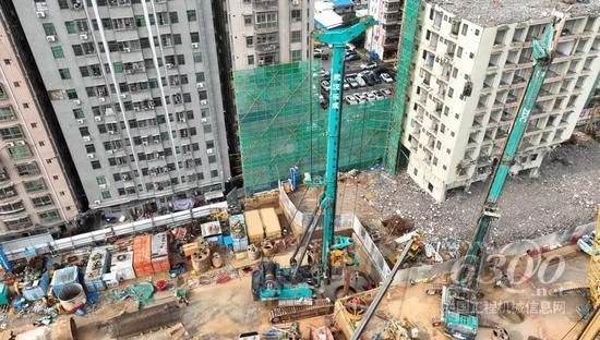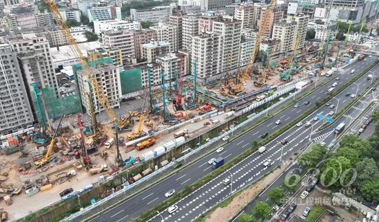 進入深圳五和站工地,一片繁忙的景象映入眼簾,場內(nèi)幾十臺大型旋挖鉆機、成槽機械、全回轉鉆機、大型履帶吊等各類基礎施工設備正緊張有序的施工中,而那成片的“山河綠”更是引人注目。