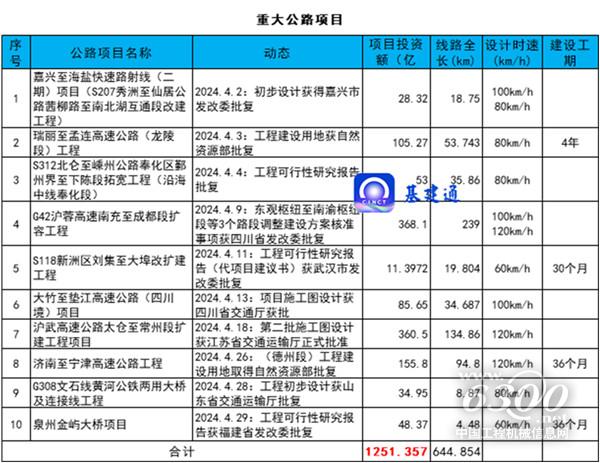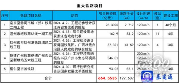 3.2024 年4月份,重大鐵路、公路工程獲批總投資超1900億元;