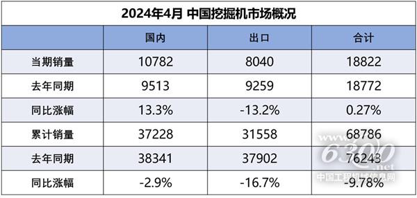 據(jù)中國(guó)工程機(jī)械工業(yè)協(xié)會(huì)對(duì)挖掘機(jī)主要制造企業(yè)統(tǒng)計(jì),2024年4月銷售各類挖掘機(jī)18822臺(tái),同比增長(zhǎng)0.27%,其中國(guó)內(nèi)10782臺(tái),同比增長(zhǎng)13.3%;出口8040臺(tái),同比下降13.2%。