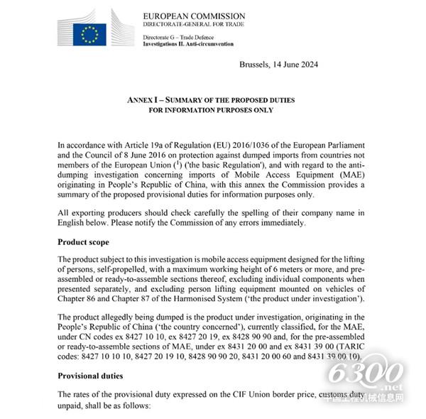 繼2023年11月歐盟對(duì)中國(guó)發(fā)起的反傾銷調(diào)查后。近日,歐盟公布了對(duì)中國(guó)企業(yè)生產(chǎn)的高空作業(yè)平臺(tái)擬征收臨時(shí)關(guān)稅的概要,最高稅率高達(dá)56.1%,超預(yù)期!歐盟委員會(huì)表示:此項(xiàng)臨時(shí)關(guān)稅旨在保護(hù)歐盟國(guó)家免受來(lái)自中國(guó)的移動(dòng)式高空作業(yè)平臺(tái)的傾銷進(jìn)口,主要針對(duì)最大高度為6米或以上的移動(dòng)式高空作業(yè)平臺(tái),以及預(yù)組裝或準(zhǔn)備組裝的部分進(jìn)口,不包括單個(gè)部件和安裝在車輛上的人員升降設(shè)備。