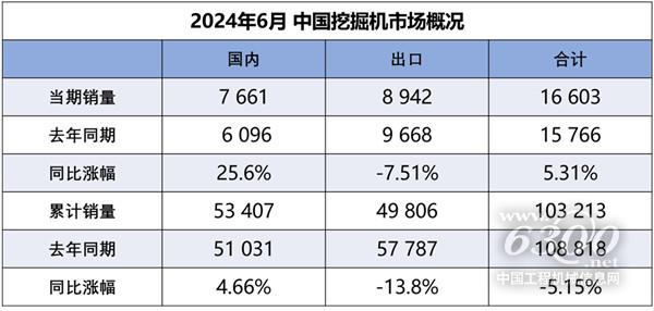 據(jù)中國工程機械工業(yè)協(xié)會對挖掘機主要制造企業(yè)統(tǒng)計,2024年6月銷售各類挖掘機16603臺,同比增長5.31%,其中國內(nèi)7661臺,同比增長25.6%;出口8942臺,同比下降7.51%。