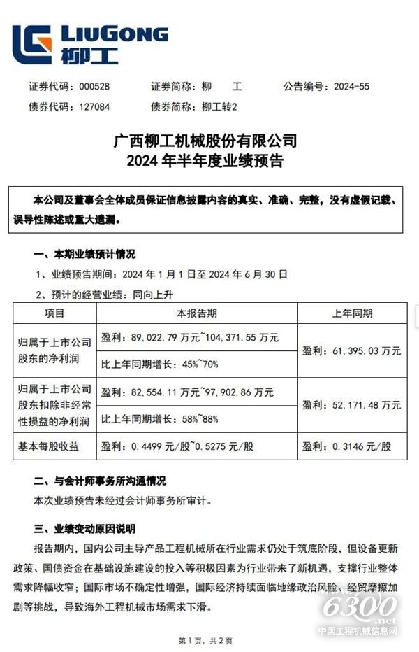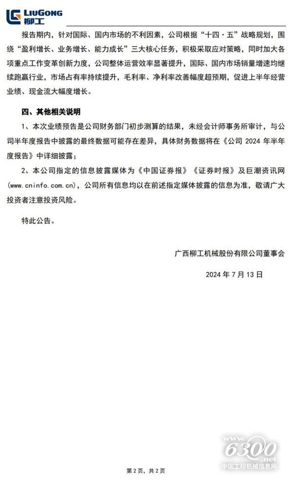本次業(yè)績預(yù)告是柳工財務(wù)部門初步測算的結(jié)果,未經(jīng)會計師事務(wù)所審計,與柳工半年度報告中披露的最終數(shù)據(jù)可能存在差異,具體財務(wù)數(shù)據(jù)將在《柳工 2024 年半年度報告》中詳細(xì)披露。