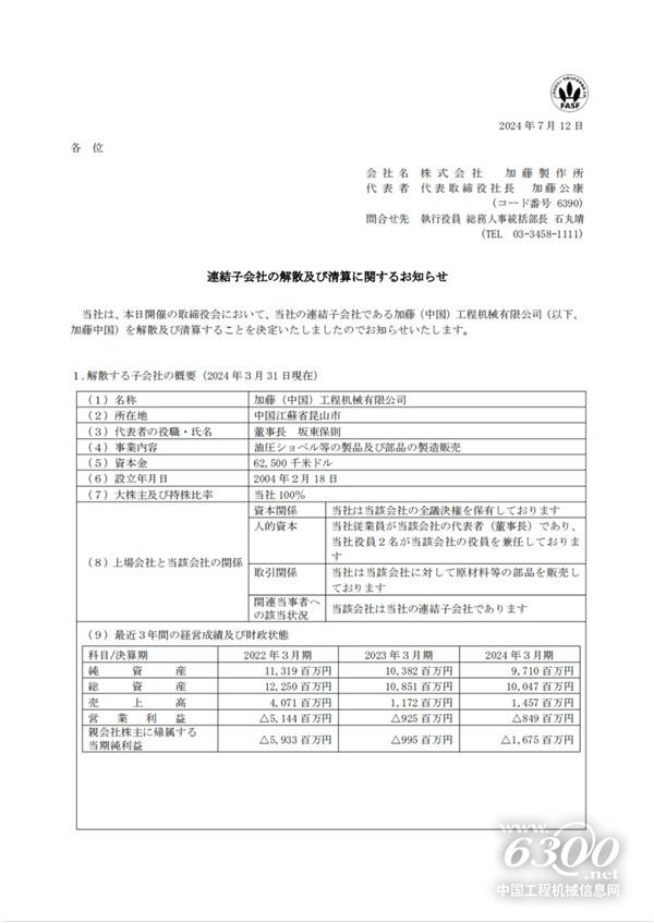 2024年7月12日,株式會社加藤制作所在官網宣布了關于加藤(中國)工程機械有限公司(簡稱“加藤中國”)解散并清算的決定,意味著加藤徹底退出中國市場。在加藤中國以及加藤中駿解散后,加藤制作所將在中國設立一個新的辦事處,來維持和應對在中國市場的產品售后服務。對于兩家子公司清算對總公司合并業(yè)績的影響,目前尚未確定。