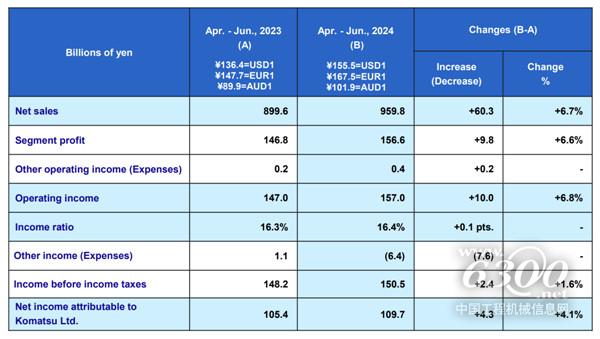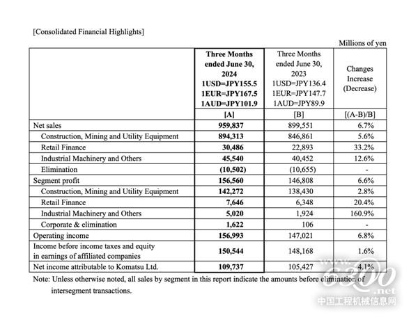 按業(yè)務(wù)板塊看:工程機(jī)械、采礦和公用事業(yè)設(shè)備:銷售額較2023年同期增長5.6%,達(dá)到8943億日元;凈利潤增長2.8%至1423億日元。零售金融:銷售額比2023年同期增長33.2%,達(dá)到305億日元;凈利潤增長20.4%至76億日元。工業(yè)機(jī)械及其他:銷售額較上年同期增長12.6%,達(dá)到455億日元;凈利潤增長160.9%至50億日元。小松方面表示,上述部門的銷售額和凈利潤雙增長主要是得益于日元貶值和設(shè)備銷售價(jià)格增長。