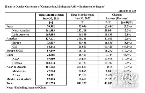 其中,北美市場(chǎng)和拉美市場(chǎng)建筑設(shè)備需求下降,基礎(chǔ)設(shè)施建設(shè)也趨于穩(wěn)定,然而受采礦設(shè)備銷量增加、日元貶值以及設(shè)備銷售價(jià)格增長的改善等因素影響,上述兩區(qū)域的銷售額分別增長12.5%和12.8%。