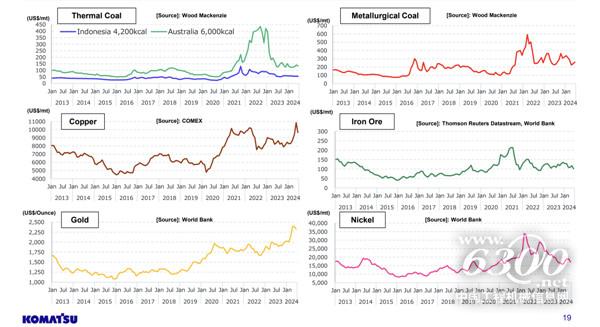 值得一提的是,小松在財(cái)報(bào)中還發(fā)布了主要礦產(chǎn)資源的價(jià)格走勢(shì)。小松方面表示:盡管存在短期波動(dòng),但預(yù)計(jì)主要礦物的價(jià)格在長期內(nèi)仍將保持在高位。其中,澳大利亞的動(dòng)力煤價(jià)格將保持穩(wěn)定,而印度尼西亞的動(dòng)力煤將略有下降。由于中國市場(chǎng)需求下降,預(yù)計(jì)2024年冶金煤和鐵礦石將溫和下降。由于電動(dòng)汽車的增長和對(duì)未來供需平衡的擔(dān)憂,銅價(jià)將波動(dòng),預(yù)計(jì)2024年將保持在高位。
