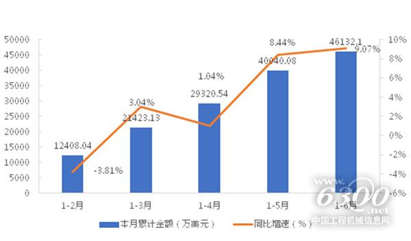 根據(jù)中國重型機械工業(yè)協(xié)會數(shù)據(jù),礦山機械行業(yè)1-6月實現(xiàn)進出口總額27.06億美元,同比增長24.38%。其中,出口額25.39億美元,同比增長24.01%;進口額1.67億美元,同比增長30.40%;進出口順差23.72億美元,同比增長23.58%。