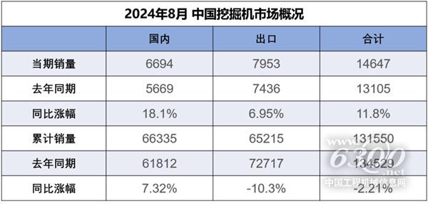 據(jù)中國工程機械工業(yè)協(xié)會對挖掘機主要制造企業(yè)統(tǒng)計,2024年8月銷售各類挖掘機14647臺,同比增長11.8%,其中:國內6694臺,同比增長18.1%;出口7953臺,同比增長6.95%。