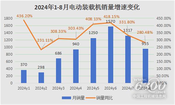 根據(jù)行業(yè)協(xié)會官方統(tǒng)計:2024年8月銷售電動裝載機955臺(3噸13臺,5噸791臺,6噸126臺,7噸24臺,8噸1臺),同比增長280.48%,單月電動化滲透率11.5%。1-8月電動裝載機累計銷量為7386臺,同比增長343.60%,滲透率為10.02%。按照單月電裝1000余臺銷量測算,全年電動裝載機累計銷量有望突破1萬臺以上。